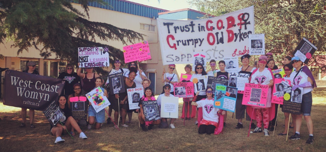 Nearly thirty women wearing bright pink and purple capes gather before the march for a group photo. Their giant banners read, “Trust in G.O.D. Grumpy Old Dykes, Sapphists, Lesbians” and “West Coast Womyn, radfem.ca”