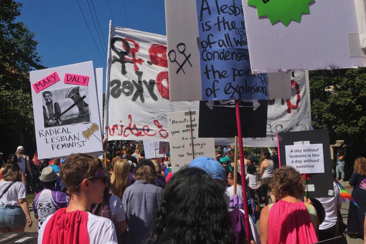Organizers of Vancouver’s Dyke March attempted to ban the double Venus symbol, an everlasting representation of Lesbianism, so that’s exactly what The Lesbians Collective carried. The women held bright neon signs with photos of their Lesbian Sheroes, like Max Dashu and Sor Juana Inés de la Cruz. Volunteers, parade marshals, and regular lesbophobes tried to intimidate these women into quiet submission, but their misogynist tactics ultimately failed. These powerful feminist messages cannot be silenced.