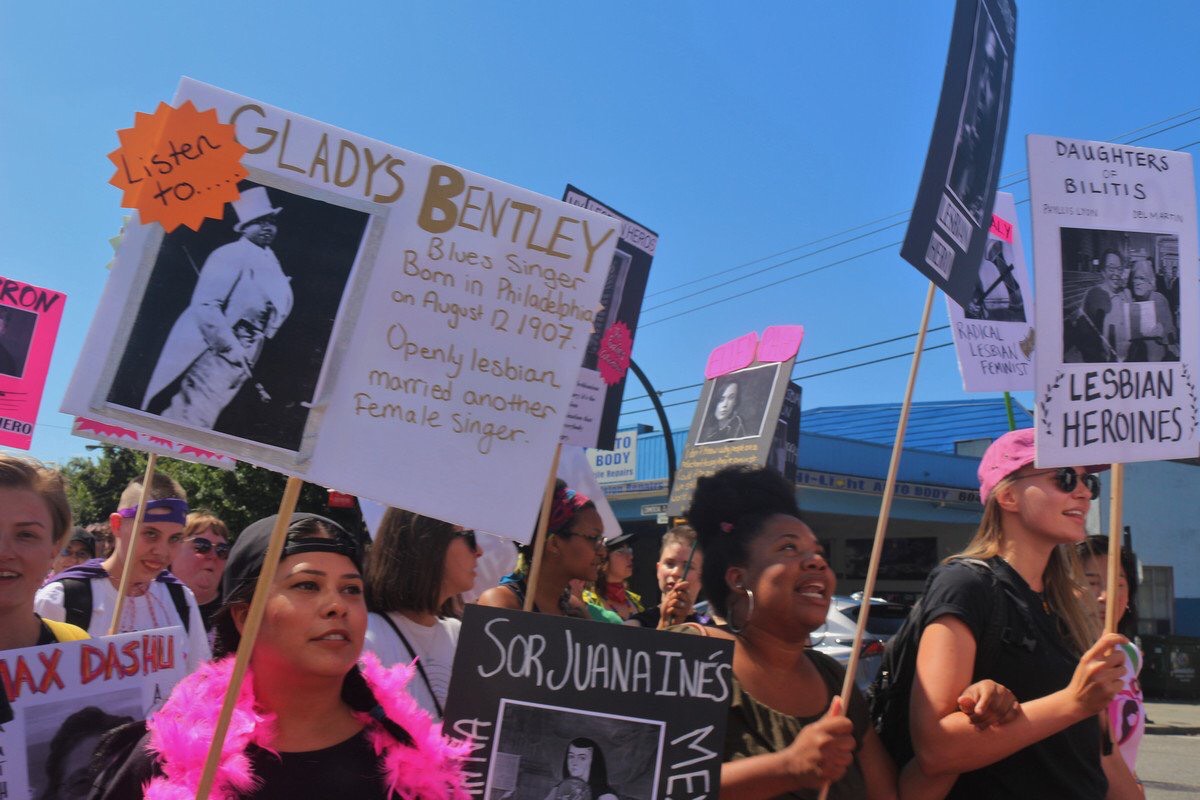 Women link arms and march with signs of Lesbian Sheroes: Gladys Bentley (blues singer born in Philadelphia on August 12, 1907, openly Lesbian, married another Female singer), Sor Juana Inés De La Cruz (Lesbiana Mexicana), Ellen Page, Max Dashu, Mary Daly (Radical Lesbian Feminist), Daughters of Bilitis (Phyllis Lyon, Del Martin, Lesbian Heroines), Ferron, and Audre Lorde (Lesbian Hero).