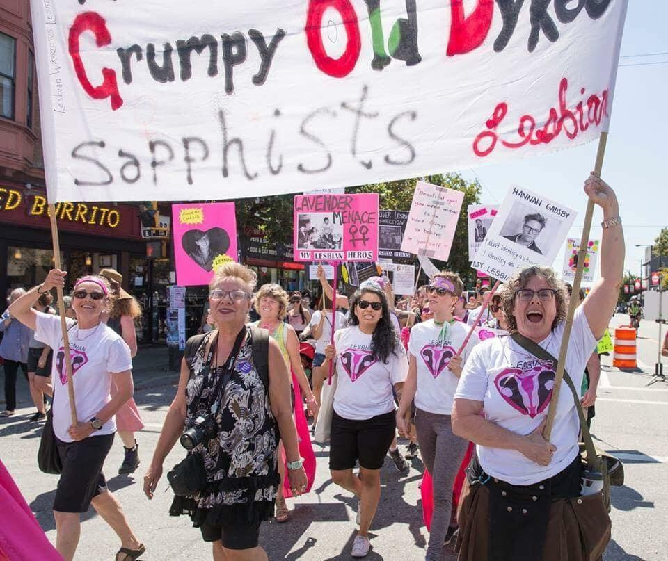 The Grumpy Old Dykes, Sapphists, and Lesbians lead the march holding their banners high and wearing white t-shirts with pink uterus shields that read “LESBIAN”. One reads sign in the background reads, “Lavender Menace, My Lesbian Heroes.”